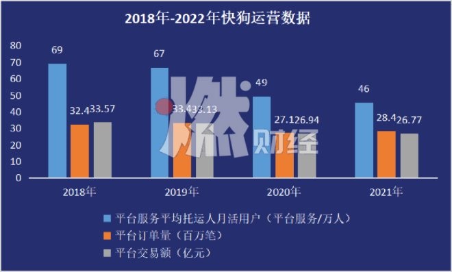 與月活托運人一起流失的是平臺接收的訂單。2021年,快狗平臺促成284萬筆訂單,較2018年的324萬下降12%;交易額27億元,較2018年的34億元下降21%。