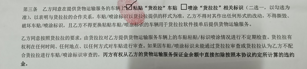 這種“因車貼破壞向司機’罰款’”的條例,在貨拉拉與司機簽訂的協(xié)議中,同樣存在。