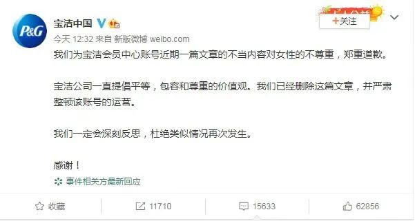 該廣告意在推廣寶潔旗下產(chǎn)品“香香5件套”,包含沐浴露、洗發(fā)水、除菌噴霧、洗衣用品等。文章發(fā)布后在網(wǎng)絡(luò)上引起爭(zhēng)議和指責(zé),沖上微博熱搜榜高位。寶潔隨后在其微博發(fā)布道歉聲明,表示寶潔公司一直提倡平等,包容和尊重的價(jià)值觀,相關(guān)文章已刪除,且將嚴(yán)肅整頓賬號(hào)運(yùn)營(yíng)。