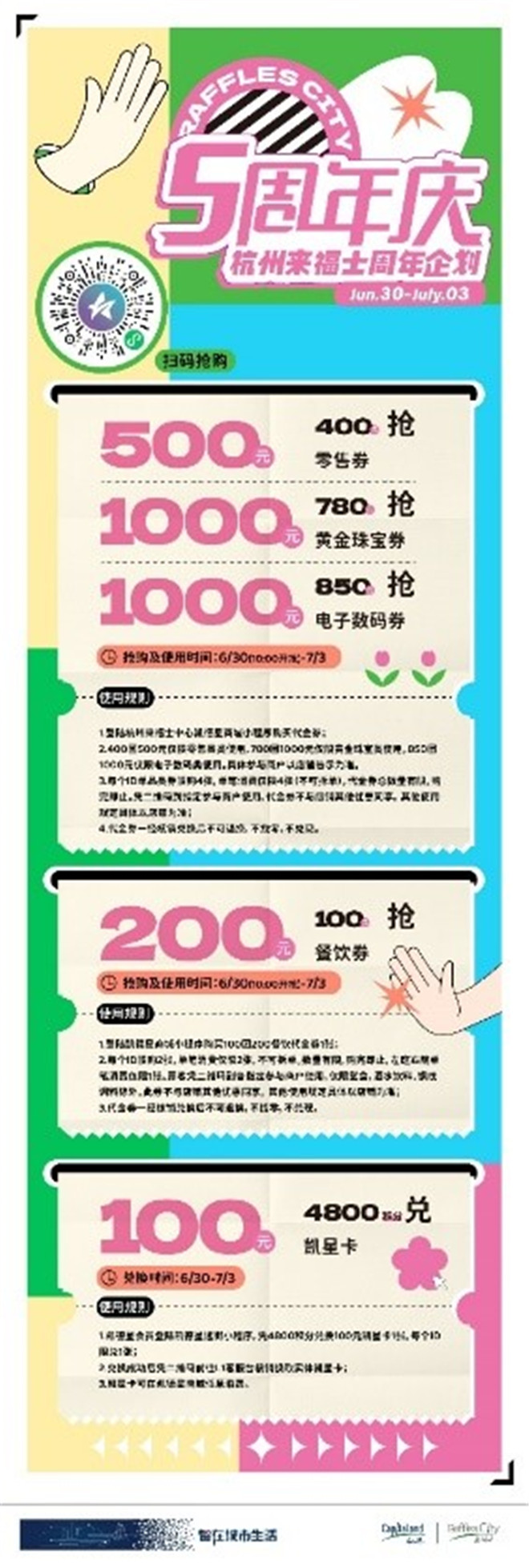 此外,杭州來福士以鉅惠的福利回饋消費者,引爆夏日購物激情。6月30日-7月3日,在凱德星商城限時搶購100抵200元餐飲代金券,400抵500元服飾零售代金券,780抵1000元黃金珠寶代金券,850抵1000元電子數(shù)碼代金券。海量驚喜好禮放肆狂歡,全方位滿足消費者對美好生活的需求。