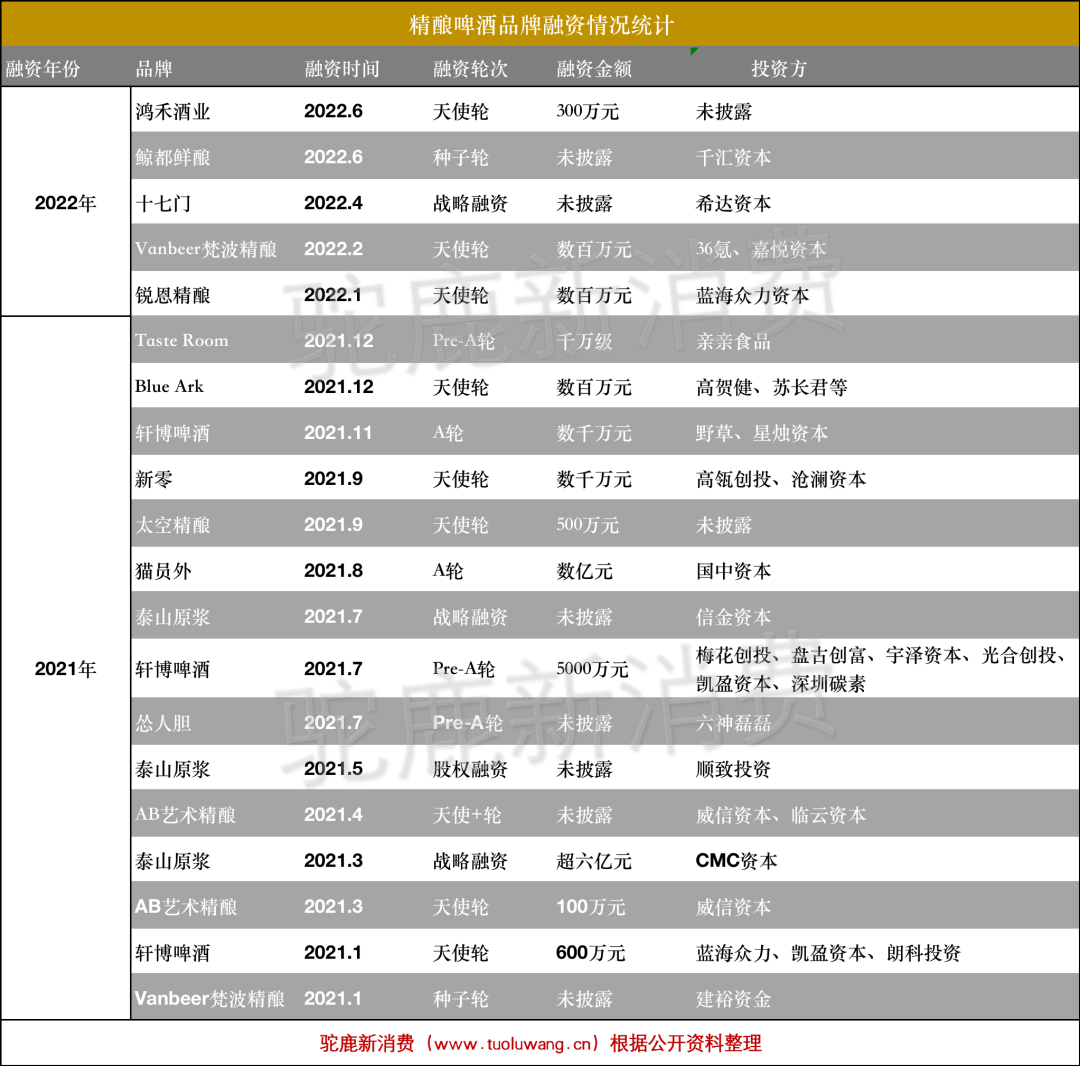 而自2017年起,就有熊貓精釀等品牌開(kāi)始陸續(xù)獲得融資,到2021年更是有大批精釀啤酒品牌受到資本的青睞。據(jù)駝鹿新消費(fèi)不完全統(tǒng)計(jì),2021年至今,精釀啤酒賽道共計(jì)發(fā)生20起融資事件,2021全年發(fā)生的融資事件高達(dá)15起。
