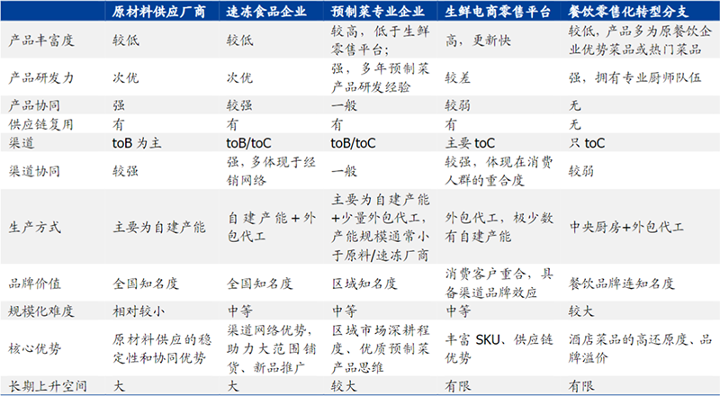 預(yù)制菜行業(yè)各類參與者各方面因素對比