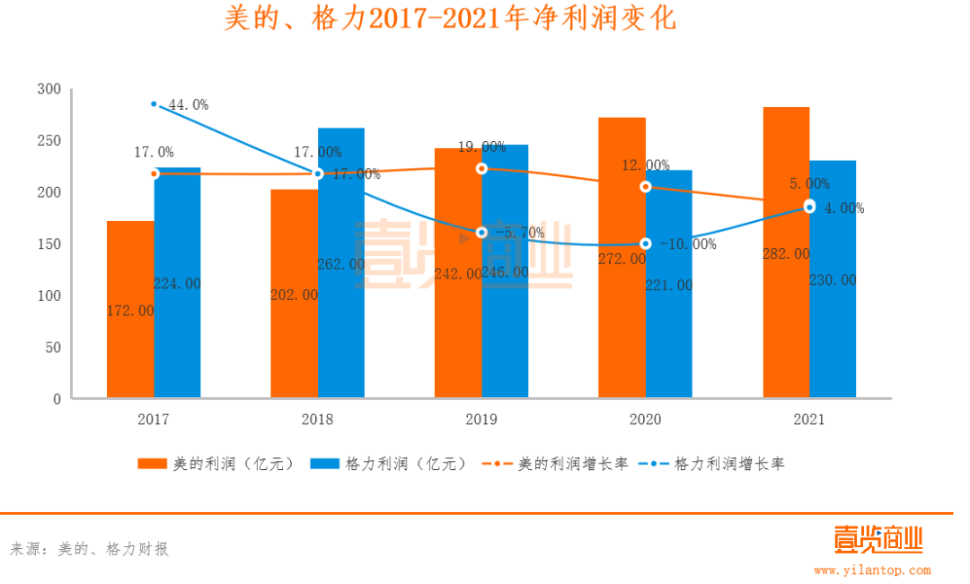 格力集團2017-2021年的營業(yè)收入分別為1500億、2000億、2005億、1704億、1895億,營業(yè)增速分別為36%、33%、0.24%、-14%、11%,2021年較2017年增長26%。美的集團的年度營收增速更快且平穩(wěn),且沒有出現(xiàn)負(fù)增長的年份;格力在營收和增速上則顯得有些不夠看。