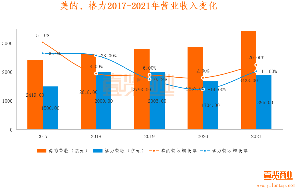 縱觀美的和格力近五年財報數(shù)據(jù),從營收端看,美的集團2017年-2021年的營業(yè)收入分別為2419億、2618億、2793億、2857億、3433億,營業(yè)收入增速分別為51%、8%、6%、2%、20%,2021年較2017年增長41%。