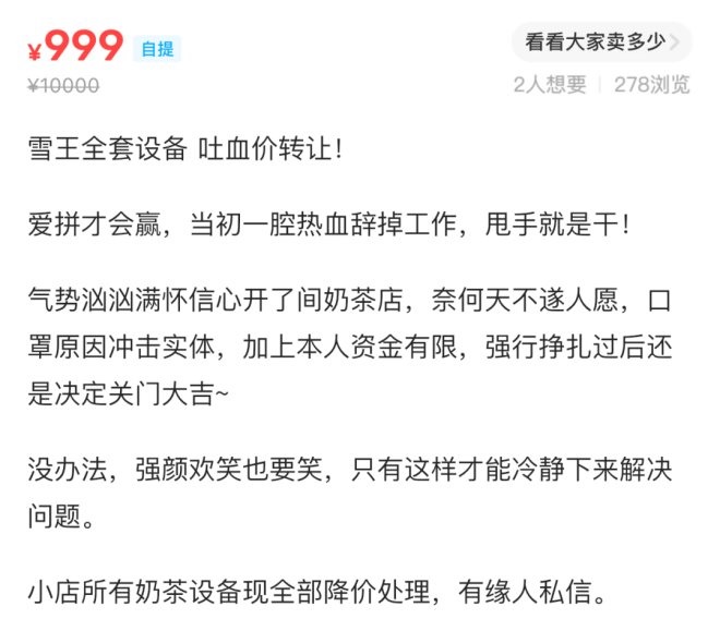 發(fā)布者是來自五湖四海的奶茶店老板,他們有的是自創(chuàng)招牌的“雜牌軍”,有的是蜜雪冰城、書亦燒仙草等連鎖品牌背后的加盟大軍,現(xiàn)在,以低至幾塊、高到幾萬的標(biāo)價(jià),再配上走心文案,甩賣設(shè)備。