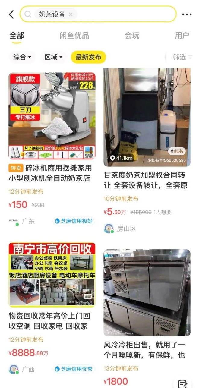 多位在閑魚轉(zhuǎn)賣設(shè)備的奶茶店老板告訴開菠蘿財(cái)經(jīng),近兩年半,受疫情影響,奶茶店持續(xù)虧損,今年以來商圈人氣很差,看不到好轉(zhuǎn)的希望,實(shí)在堅(jiān)持不下去只好閉店,現(xiàn)在就指望在二手交易平臺轉(zhuǎn)手設(shè)備,回籠一部分資金了。