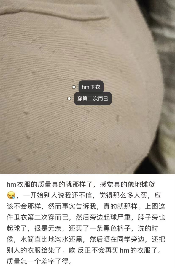 在微博#HM關(guān)閉中國首店#的熱搜話題下,不少網(wǎng)友表示,H&M的衣服質(zhì)量太差了,希望早日離開中國市場(chǎng)。小紅書上,以“HM質(zhì)量”為關(guān)鍵詞,可以看到大量吐槽品牌產(chǎn)品質(zhì)量的筆記。有博主寫到,衛(wèi)衣買來第二次穿就起球嚴(yán)重,黑色褲子洗的時(shí)候一直在掉色。不會(huì)再買H&M的衣服了。