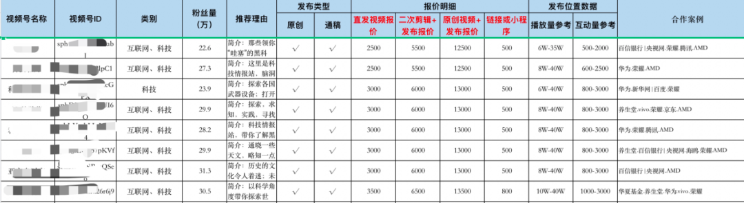 不過,視頻號大V主要收入來源以行業(yè)頭部公司為主,可是大多小打小鬧。下圖可以看出,一個(gè)粉絲量在30萬左右的互聯(lián)網(wǎng)科技類視頻號,一條原創(chuàng)視頻內(nèi)容的報(bào)價(jià)在13000元左右,其合作客戶不乏華為、京東、AMD等科技巨頭。