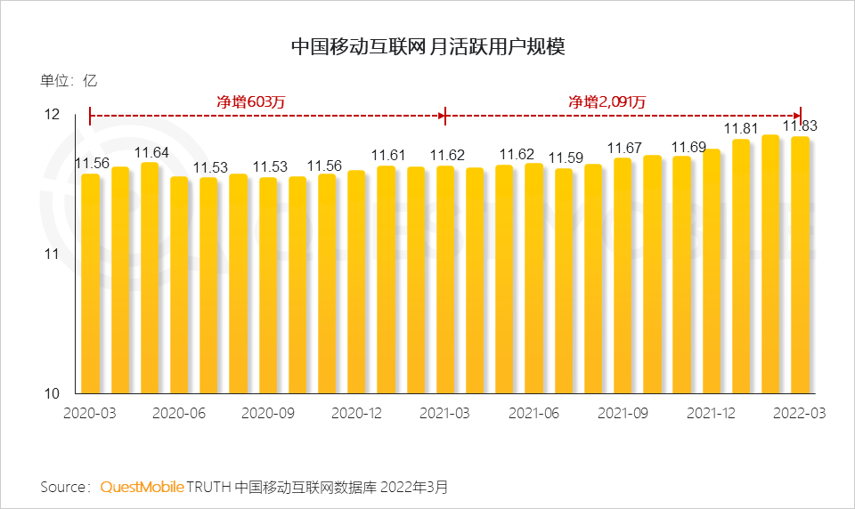 但其實事實是,移動互聯(lián)網(wǎng)的流量目前還沒有完全見頂,甚至還在增長之中。根據(jù)QuestMobile數(shù)據(jù)顯示,2022年一季度,移動互聯(lián)網(wǎng)甚至迎來了一次流量增長小高峰,截至3月末,月活躍用戶規(guī)模達到11.83億,月人均使用時長達到了162.3小時,月人均使用次數(shù)達到了2,637.1次,同比分別增長了12.1%、4.4%,用戶時長同比增長再次重回兩位數(shù)。