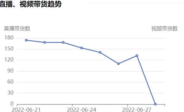 以最近爆火的東方甄選賬號的數(shù)據(jù)為例,據(jù)抖怪獸數(shù)據(jù)顯示,6月21日至6月27日,東方甄選直播帶貨數(shù)量整體呈下降趨勢,從6月21日的174件下降到了6月27日的132件,其中6月26日最低值為110件。