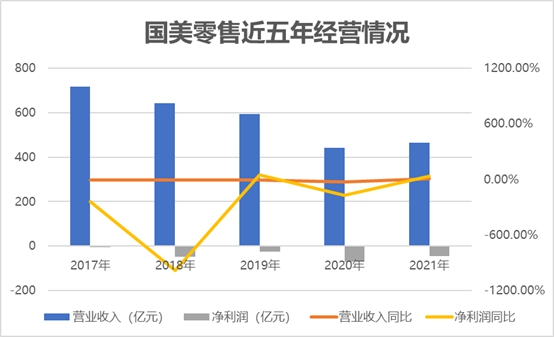 另一方面,從經(jīng)營情況來看,國美零售的營業(yè)收入逐年下滑,且公司已經(jīng)連續(xù)五年出現(xiàn)經(jīng)營虧損。