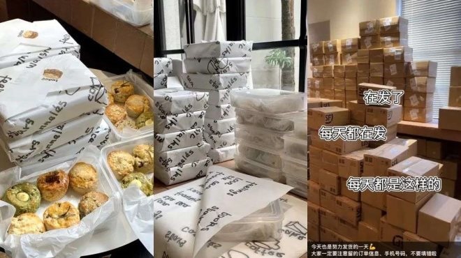 他們的生意十分火爆,朋友圈里曬滿了“戰(zhàn)績”:有工作人員打包烘焙品的視頻,也有即將發(fā)出的面包、咖啡快遞堆成小山的照片。