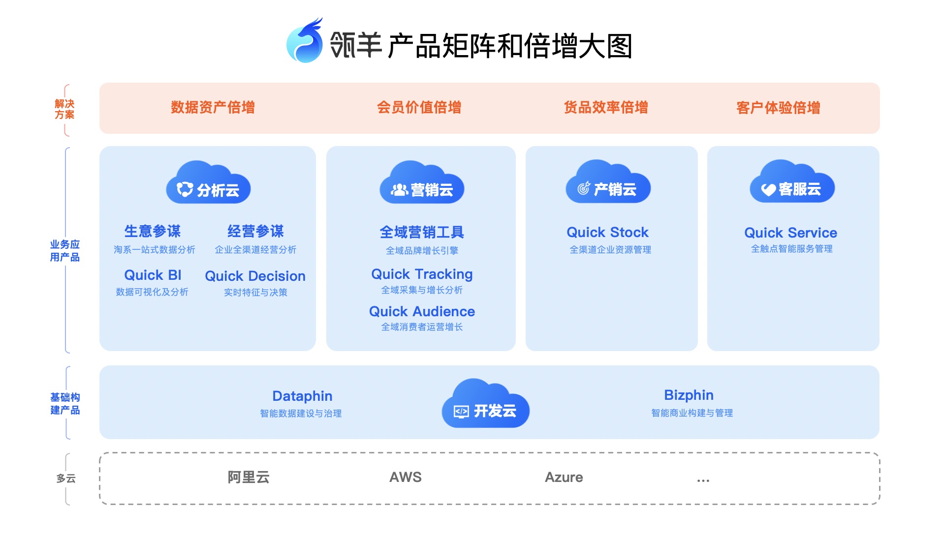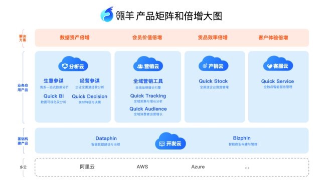 目前,瓴羊旗下有分析云、營銷云、產(chǎn)銷云、客服云、開發(fā)云五大產(chǎn)品矩陣,包含Dataphin、Bizphin、Quick Audience、Quick BI、生意參謀、經(jīng)營參謀等11個核心產(chǎn)品。