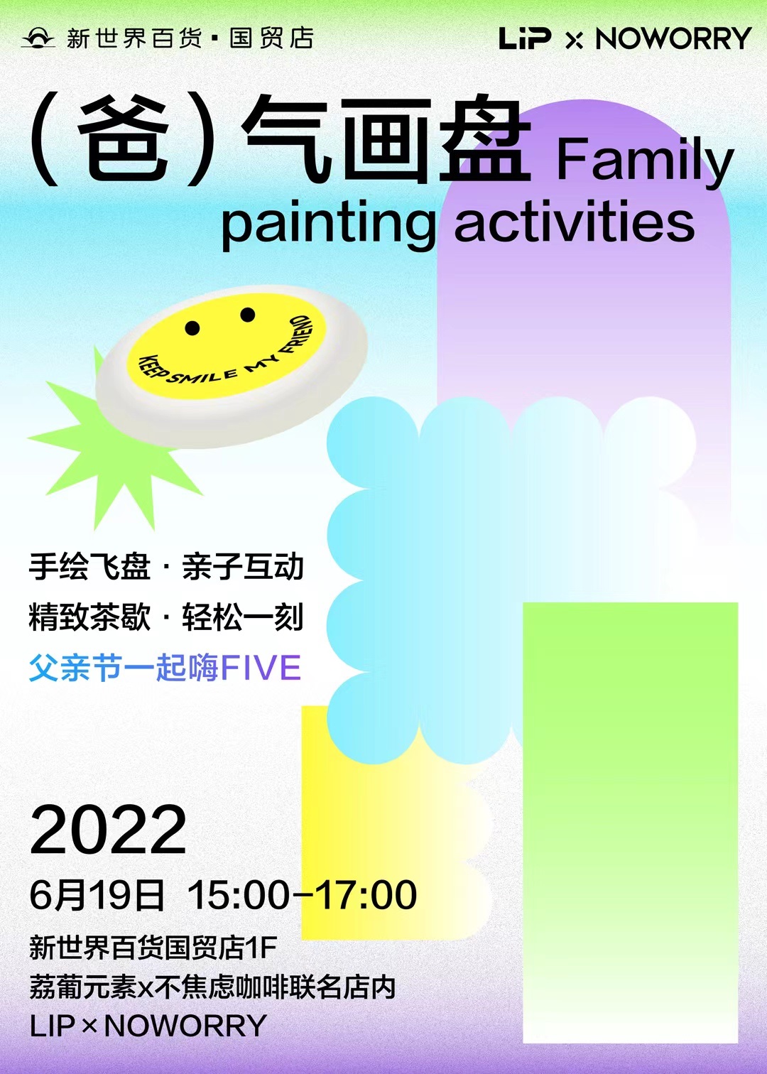 2022年6月19日是一年一度的父親節(jié)。新世界百貨建設(shè)店聯(lián)合武漢集合店LIP&NOWORRY組織策劃“爸”氣畫盤-父親節(jié)DIY專場(chǎng)會(huì)員活動(dòng),特邀店內(nèi)親子類會(huì)員到店,讓寶貝們親自體驗(yàn)與爸媽一起手繪飛盤,了解飛盤運(yùn)動(dòng)的文化樂(lè)趣、享受“不焦慮咖啡”帶來(lái)的輕松茶歇,讓會(huì)員沉浸在親子互動(dòng)的午后時(shí)光。