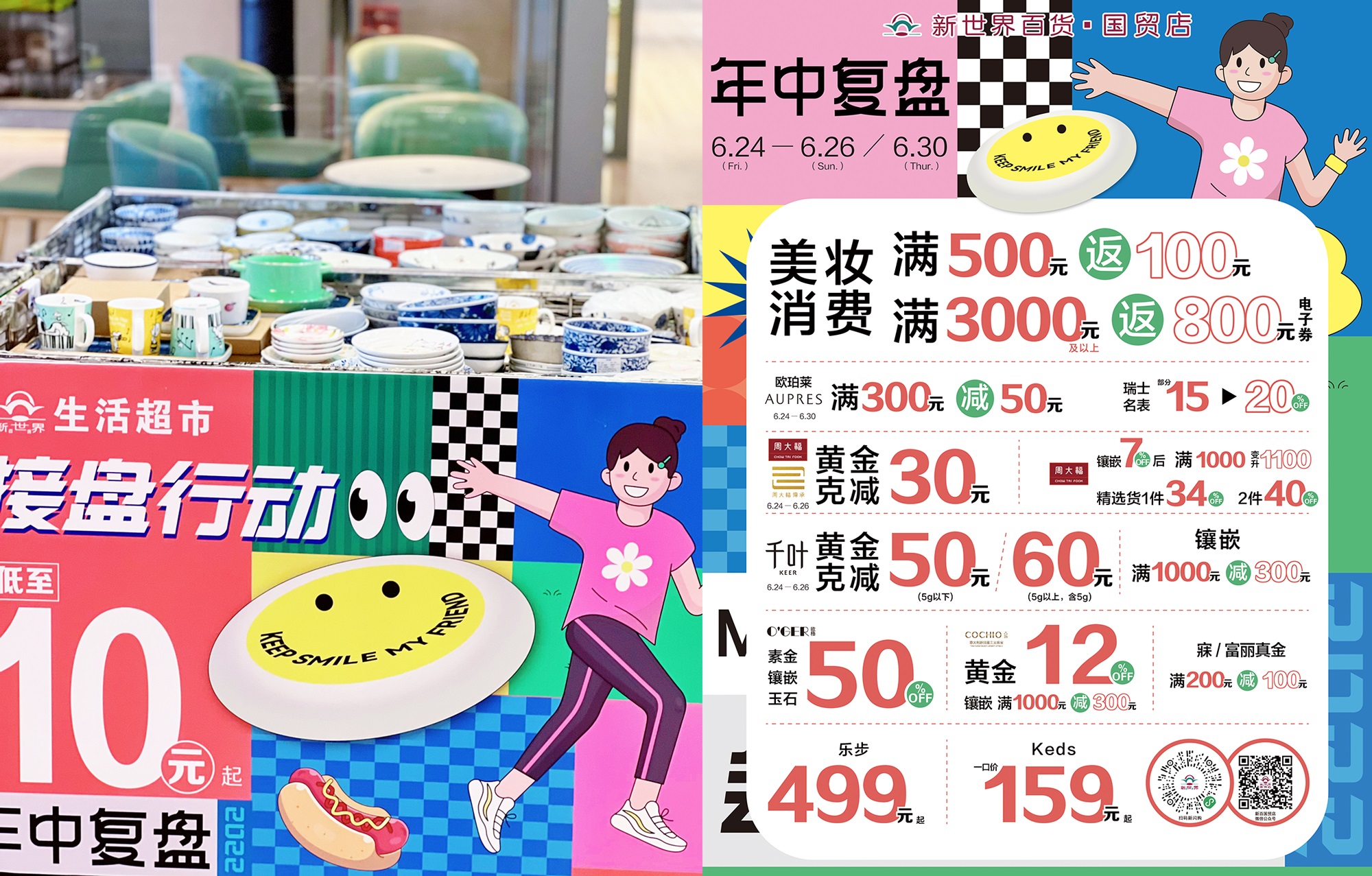 6月24日-30日,新世界百貨武建設(shè)店生活超市以“半年半價(jià)年中慶”作為主力活動(dòng)。在戶外聯(lián)動(dòng)日本進(jìn)口餐具品牌CREAM開展生活超市“接盤周”主題市集。全場(chǎng)精品餐盤選擇眾多,另有10元起優(yōu)惠力度加持,通過(guò)各渠道宣傳,受到多年齡消費(fèi)群的喜愛,擴(kuò)大了武漢建設(shè)店生活超市消費(fèi)的輻射范圍,突破場(chǎng)域營(yíng)銷從而帶動(dòng)近期客流增長(zhǎng)。