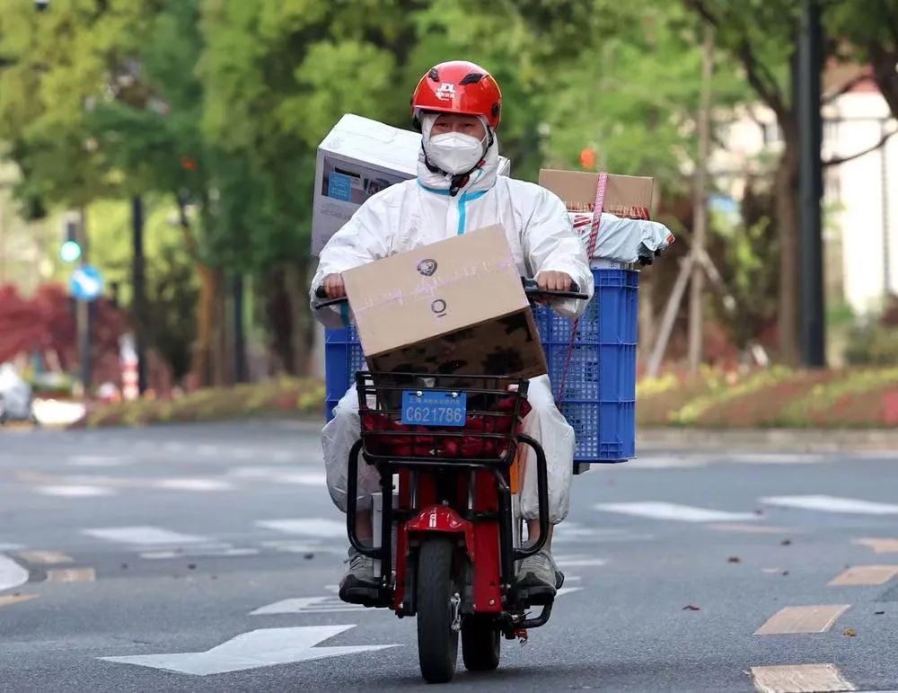 在超長的隔離時(shí)間下,快遞小哥的到來對于封控在小區(qū)的居民來說意義非凡,因?yàn)樗麄兪蔷徑馕镔Y緊缺窘境的“及時(shí)雨”。