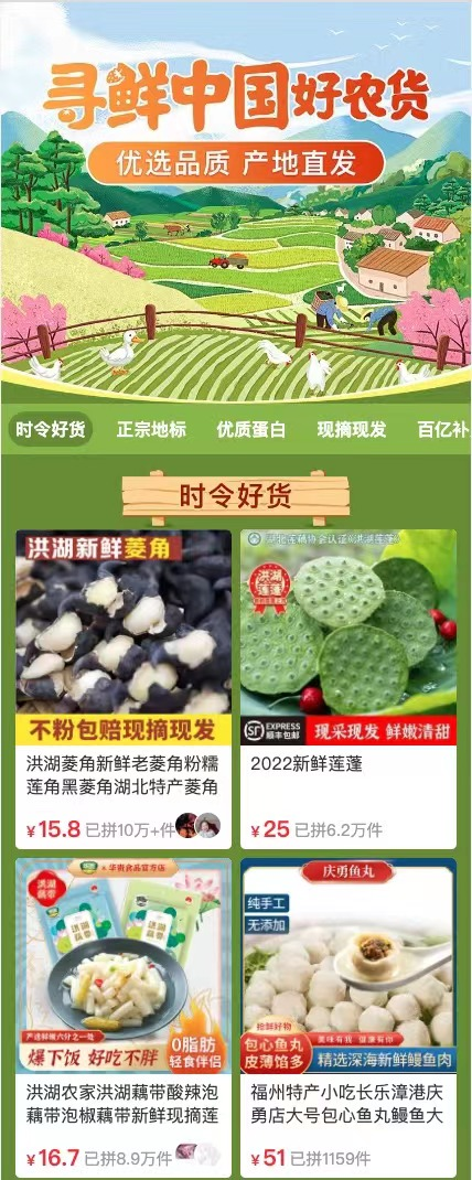 作為中國最大的農(nóng)產(chǎn)品上行平臺,拼多多發(fā)起“尋鮮中國-多多好農(nóng)貨”項目,在全國尋找最新鮮的當季食材,向平臺用戶介紹各地的“好農(nóng)貨”,活動期間,拼多多將堅持農(nóng)產(chǎn)品“零傭金”以及“拼購+產(chǎn)地直發(fā)”的模式,針對不同農(nóng)產(chǎn)品品類制定、完善“好農(nóng)貨”標準,并對符合標準的農(nóng)產(chǎn)品進行資源傾斜。