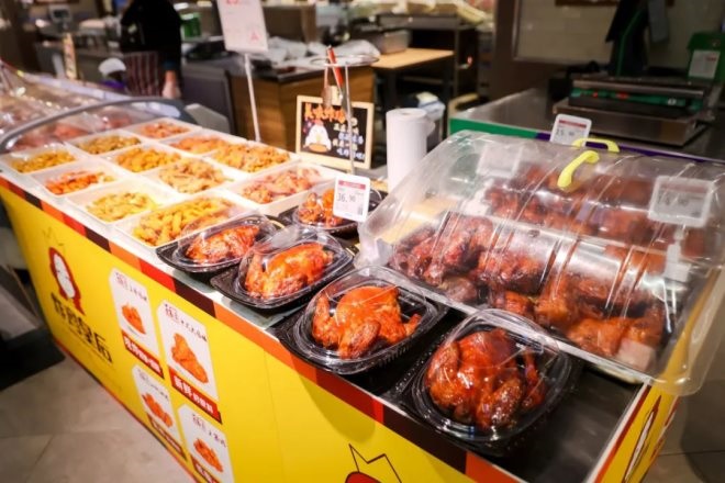 值得一提的是,超市的加工區(qū),烤雞、烤鴨、現(xiàn)撈鹵味、涼菜、各類面條面點俱全,還設(shè)置了小步工坊檔口和現(xiàn)撈鹵味檔口。