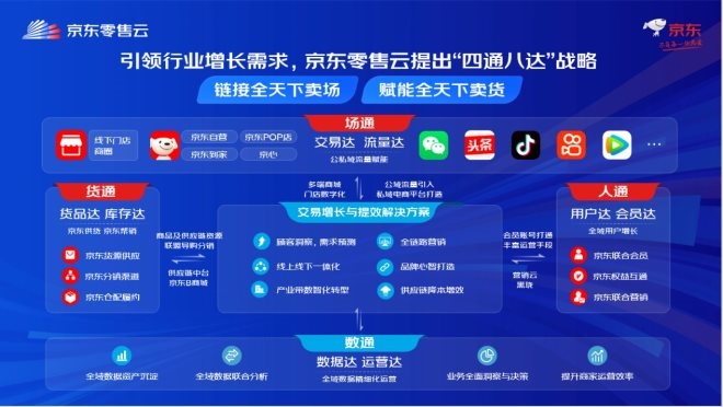 作為京東零售旗下的數(shù)智化解決方案提供商,京東零售云致力將京東零售技術(shù)能力與生態(tài)能力全面對外賦能,在泛零售行業(yè)與京東之間架起橋梁。基于行業(yè)需求不斷升級,京東零售云也推出全新的“四通八達”戰(zhàn)略。