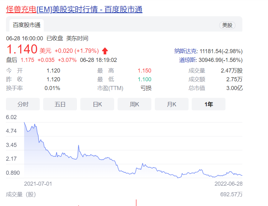 虧損也反映到股市之中,如今怪獸充電股價已從最高10美元/股跌至1.14美元/股,公司股價已經(jīng)跌去超九成,總市值僅剩下3億美元。