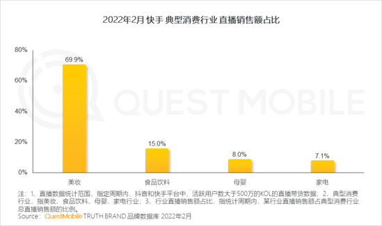 并且相比利潤極低的農(nóng)產(chǎn)品而言,美妝產(chǎn)品可謂是直播間的常客,據(jù)QuestMobile數(shù)據(jù),2022年2月,在抖音直播中,美妝產(chǎn)品銷售額占典型消費行業(yè)的31.2%,僅次于食品飲料,而在快手平臺,美妝產(chǎn)品銷售額占比則達到了驚人的69.9%。