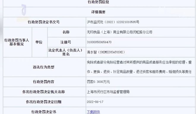 天眼查APP顯示,近日,無印良品(上海)商業(yè)有限公司閔虹路分公司,被上海市閔行區(qū)市場監(jiān)督管理局罰款3000元。