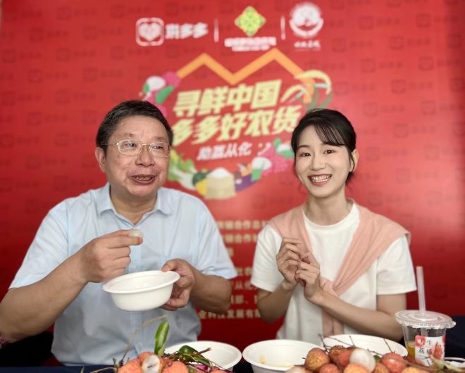 而6月正是廣州荔枝的“表演時間”,大量晚熟優(yōu)質(zhì)的荔枝品種陸續(xù)上市!叭杖昭L(fēng)卷瘴煙,南國珍果荔枝先。在廣州從化,每年六七月份是荔枝上市的高峰期。希望大家踴躍拼單,為從化的鄉(xiāng)村振興、農(nóng)民致富貢獻(xiàn)自己的力量。”在拼多多的助農(nóng)直播間內(nèi),吳尚偉對著鏡頭侃侃而談,“接下來我給大家展示一下從化的桂味荔枝。桂味荔枝的特點就是核小,肉質(zhì)爽脆清甜,吃了香在口甜在心,各位朋友們趕緊下單,和我們一起共享美味珍果!”吳尚偉現(xiàn)場品嘗了桂味荔枝后,還向網(wǎng)友們科普了“加工成果干”“做成荔枝飲品”等荔枝儲存辦法。
