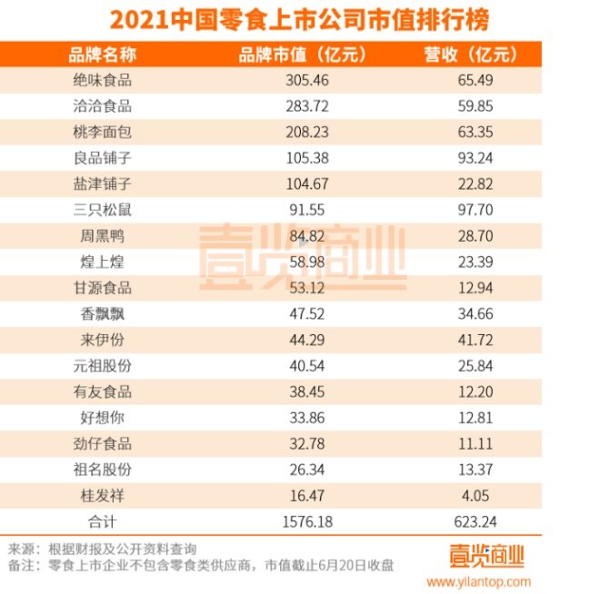 2021中國零食上市公司市值排行榜 :三只松鼠貶值最快