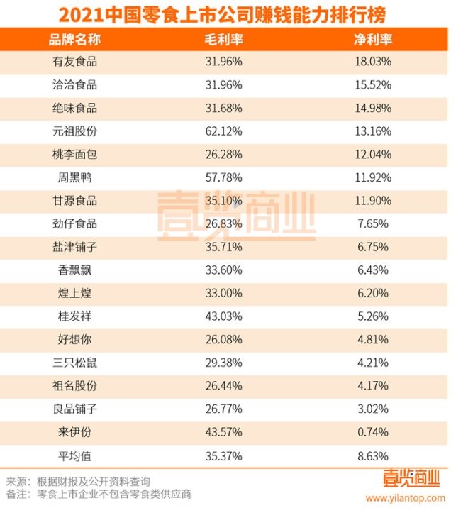 2021中國零食上市公司賺錢能力排行榜:來伊份最慘