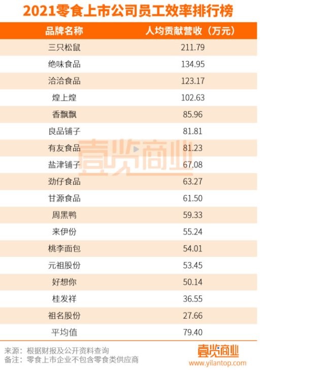 2021中國零食上市公司員工效率排行榜:三只松鼠員工最能干