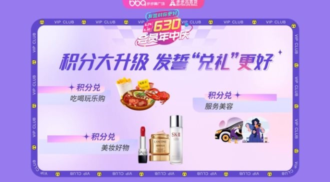 年中慶期間,會員可使用積分在Better Mall小程序上超值兌換百貨券、餐飲券、電影票、童玩券,還可參與積分抽獎,充分享受積分價值。本次步步高也創(chuàng)新性地與品牌合作,為品牌會員積分權(quán)益加碼,共同實現(xiàn)有效導(dǎo)流。