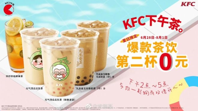 在產(chǎn)品宣發(fā)上,肯德基曾動(dòng)用多位明星代言人做茶飲新品宣傳,還和國(guó)產(chǎn)動(dòng)畫(huà)、電視劇IP聯(lián)名發(fā)起買(mǎi)奶茶送周邊活動(dòng)。肯德基慣用的促銷(xiāo)方式“第二杯0元”,常用于茶飲產(chǎn)品,此外也經(jīng)常搭配店內(nèi)小食、新品茶點(diǎn)做下午茶套餐,以拓寬茶飲的銷(xiāo)售場(chǎng)景。