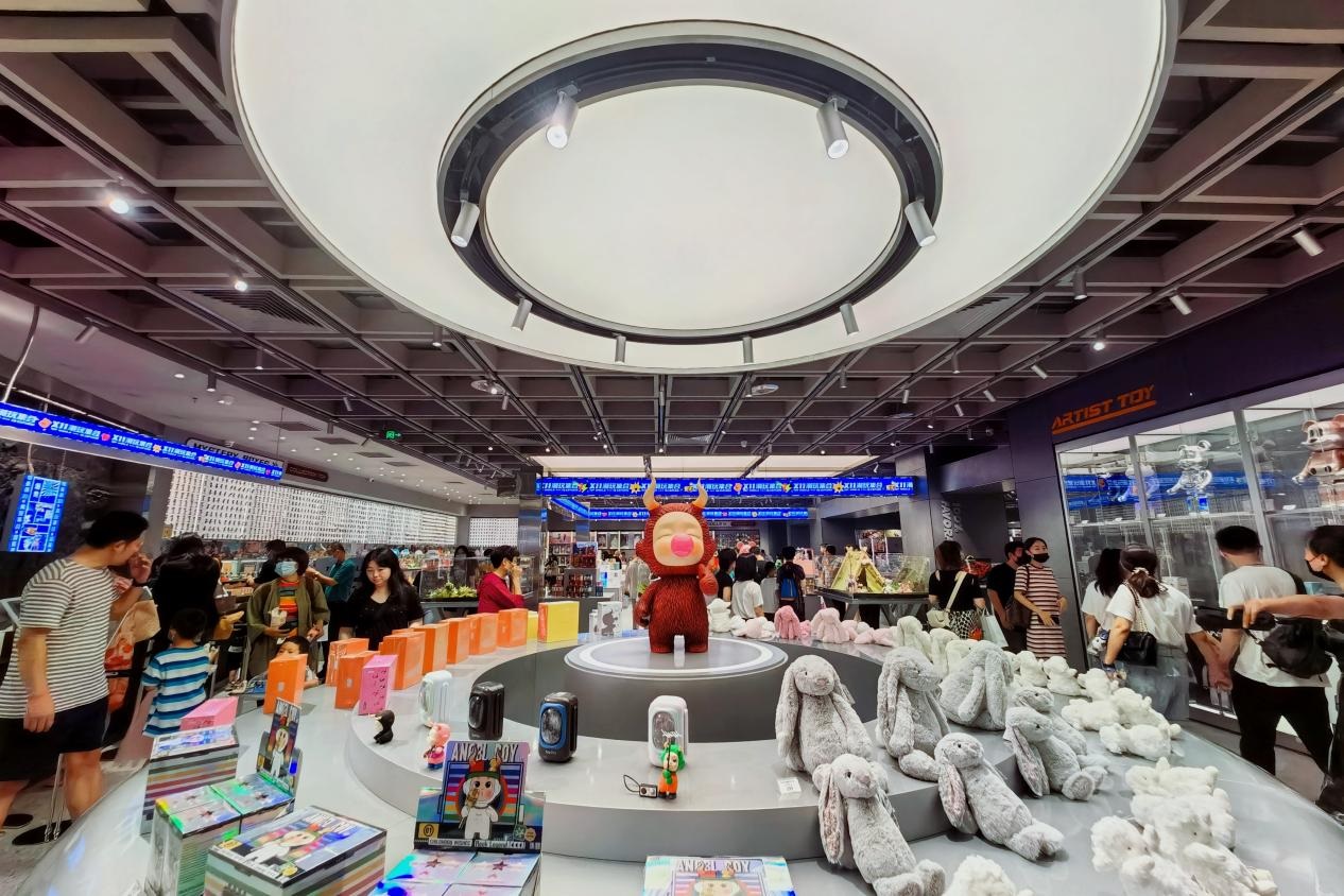 該店空間涉及致敬庫布里克的宏篇巨作——《2001太空漫游》電影,并以此為設計靈感,在金屬風中融入“宇宙飛船”、“星球土壤”等元素,將店鋪變成藝術廊,國產(chǎn)機甲、高達、手辦、毛絨玩具等十余種品類置身于藝術空間,開業(yè)當天,便吸引了大批消費者慕名而來。