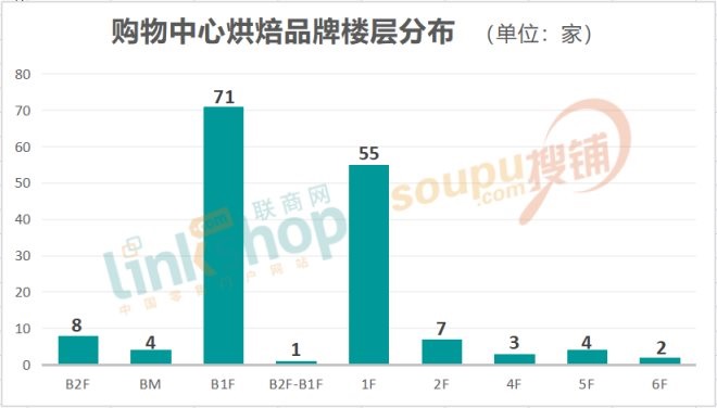 統(tǒng)計結(jié)果顯示,烘焙品牌普遍偏愛低樓層,155家門店中71家選址負(fù)一樓,占比49%;一樓次于負(fù)一樓,有55家門店,占比35%;剩下的樓層里負(fù)二樓、二樓的開店數(shù)也相較多些,其他樓層比較平均。值得一提的是,在本次統(tǒng)計中的23家購物中心里,沒有一家烘焙品牌在三樓開店,這或許與商場的樓層業(yè)態(tài)規(guī)劃有關(guān)。