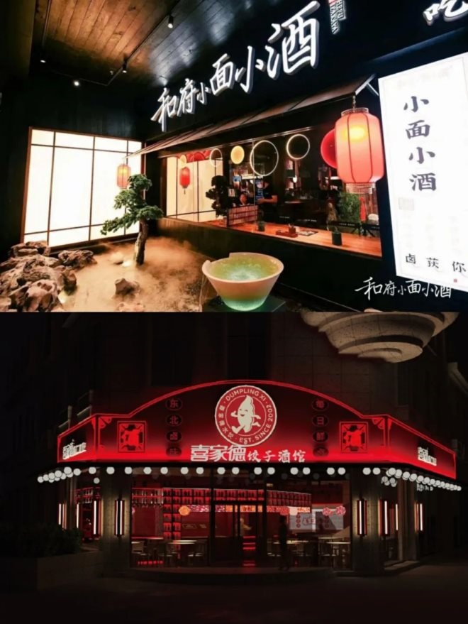 喜家德餃子酒館也是同樣的路徑,標志性紅色、餃子形門頭,滿眼霓虹燈,墻上張貼著“餃子就酒,越喝越有”的宣傳口號。