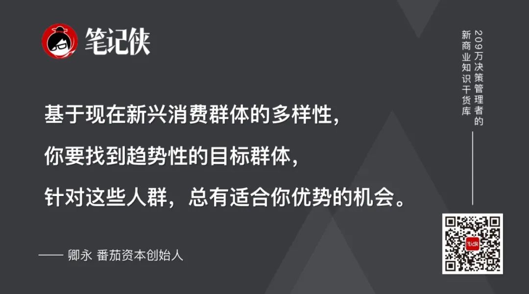 在這里提醒大家,基于現(xiàn)在新興消費群體的多樣性,你要找到趨勢性的目標群體,針對這些人群,總有適合你優(yōu)勢的機會。