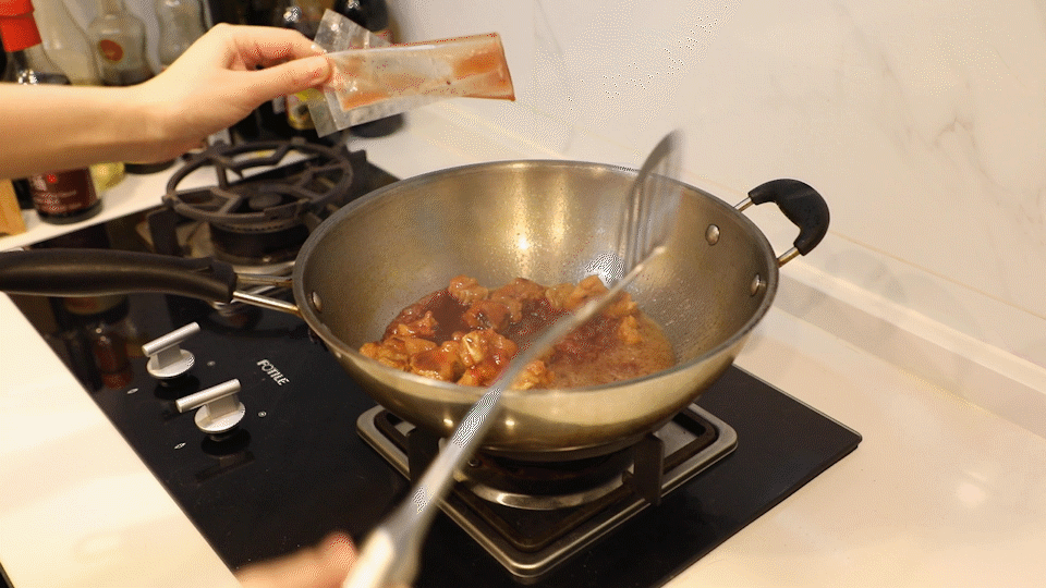 這個生炒排骨面衣已經(jīng)預(yù)炸定型過一次,所以微博解凍3分鐘、大火猛炒3分鐘,再燒汁2分鐘澆到排骨上即可。
