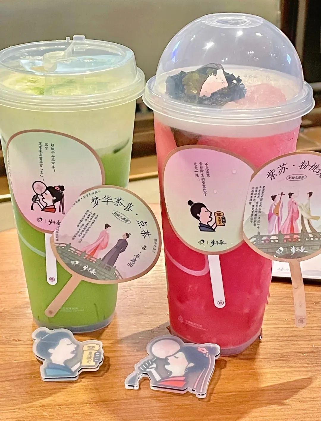 1、推出夢華茶喜·點茶、紫蘇·粉桃飲兩款定制產品,定價分別為19元和15元