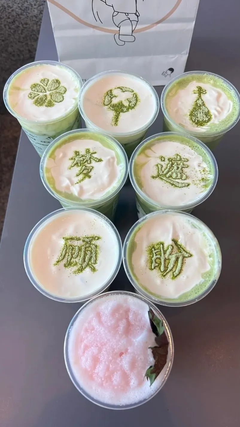 飲品頂部的芝士奶蓋上,有用抹茶粉“寫”成的聯(lián)名主題字樣和圖案,共有7款不同的樣式,分別為“顧”“盼”“夢”“遮”四個字,以及琵琶、花鈿、小扇子三種花樣,和劇中茶湯上作畫的“茶百戲”傳統(tǒng)技藝相呼應。
