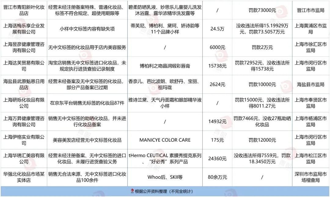 從罰金來看,新型美妝集合店“HARMAY 話梅”關(guān)聯(lián)公司上海話梅樂享企業(yè)發(fā)展有限公司的罰金最高,單次被罰近73.5萬元,沒收違法所得15.2萬元。據(jù)青眼統(tǒng)計,這批中文標簽違規(guī)的化妝品全部都是國際大牌中小樣,其標簽違規(guī)問題主要集中在標簽無化妝品成分表、無生產(chǎn)批號、無進口化妝品備案文號這三方面。(《詳見《禍起小樣,話梅被罰沒88萬!》)