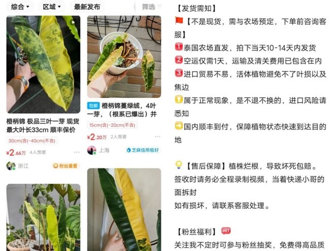 在閑魚上搜索“熱植”,可以看到銷售綠色植物的賣家以云南、廣州、深圳居多,銷售價格從幾十元到上萬元不等,還有的賣家搞起了“預(yù)售”,在簡介中強調(diào)非現(xiàn)貨、需與泰國農(nóng)場預(yù)定。其中一株價格兩萬元的橙柄錦銷售頁面已有上千次瀏覽。