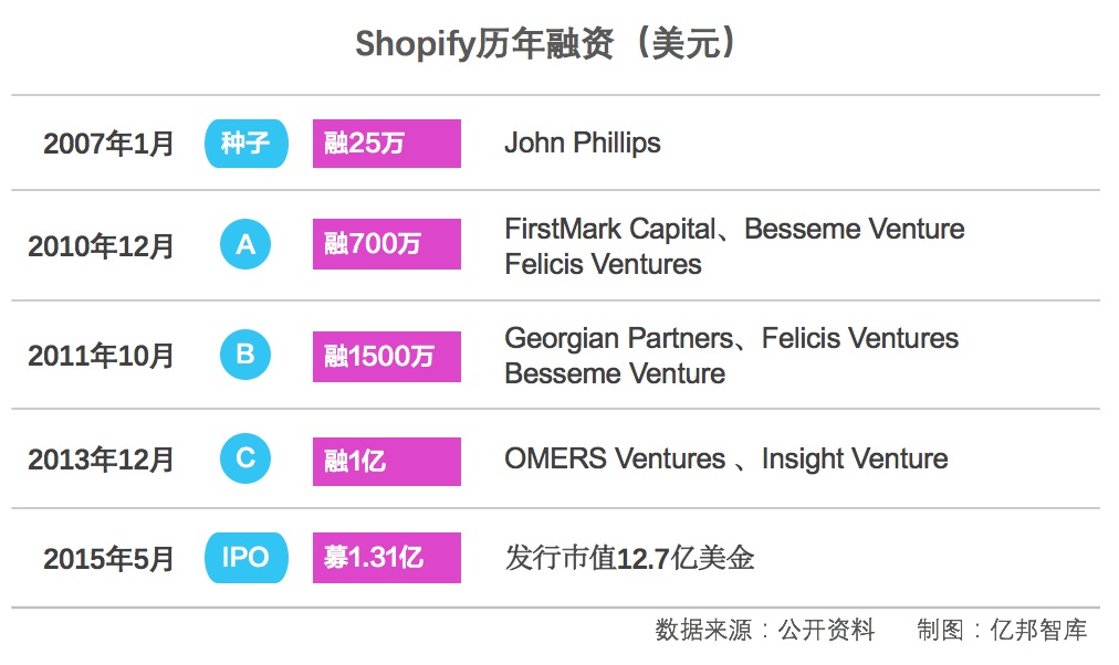 亮眼的業(yè)務(wù)增長,讓Shopify先后拿到柏尚投資(Besseme)、Georgian Partners等機(jī)構(gòu)兩輪總計2200元美元投資。資本加持下,圍繞中小商戶建站需求和開店的支付、物流、營銷需求,Shopify開始擴(kuò)大服務(wù)產(chǎn)品,并于2014年營收突破1億美元大關(guān)。