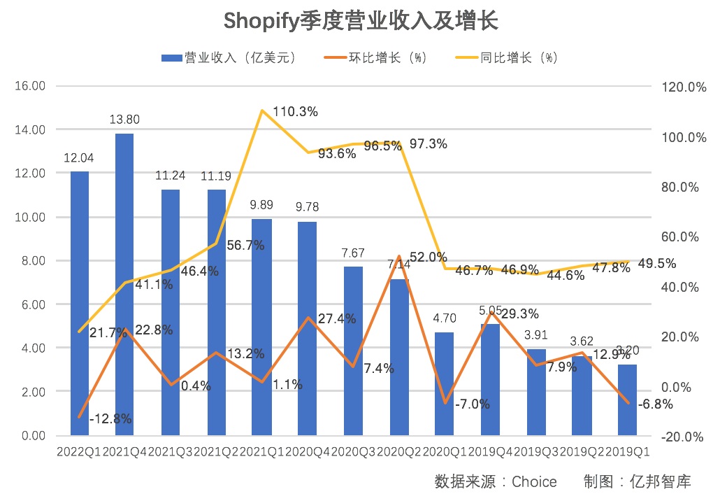 2022年一季度Shopify實(shí)現(xiàn)營收12億美元,環(huán)比下降12.78%;同比增長22%,增速較疫情前下降超一半。疫情前,2019年連續(xù)四個季度,Shopify營收增速均在40%以上。事實(shí)上,從2021年四季度開始,Shopify的營收同比增速就開始低于疫情前,疫情帶來的業(yè)績提前透支影響開始顯現(xiàn)。