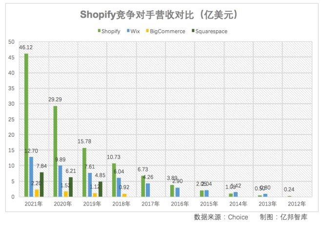 對比目前上市的四家企業(yè),Shopify營收遠(yuǎn)遠(yuǎn)領(lǐng)先一眾競爭對手。2021年Shopify實(shí)現(xiàn)營收46.12億美元,Wix實(shí)現(xiàn)營收12.7億美元,第三名Squarespace實(shí)現(xiàn)營收7.84億美元。Shopify營收是第二名Wix的的3.6倍,是第三名Squarespace的5.88倍。