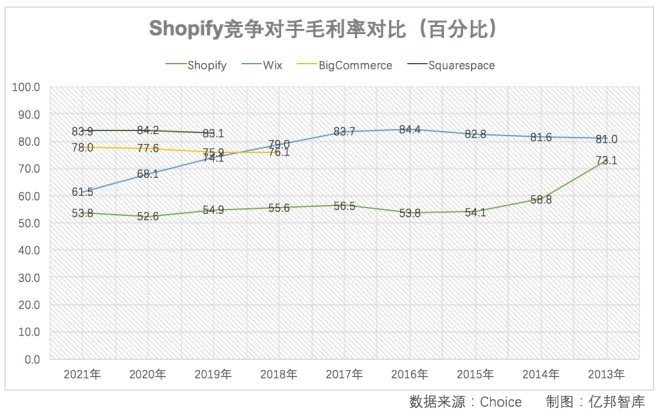 毛利率的高低與企業(yè)發(fā)展階段和業(yè)務(wù)模式密切相關(guān),SaaS企業(yè)發(fā)展初期毛利率高,隨后毛利下降進(jìn)入一個穩(wěn)定水平。此外,輕服務(wù)SaaS比重服務(wù)SaaS毛利高。2021年,Wix來自訂閱收入的占比為74.8%,SquareSpace占比70.7%,BigCommerce占比70.47%,Shopify占比29%。