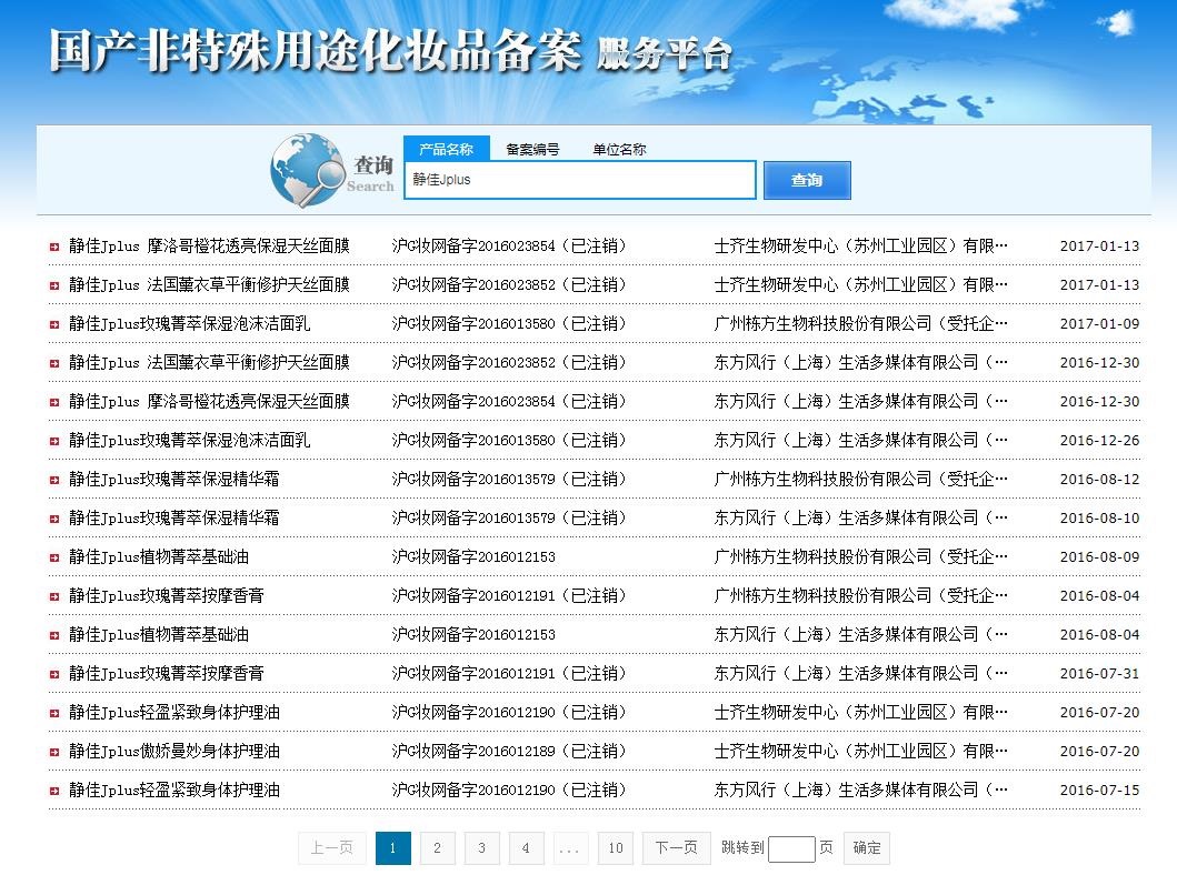 第二種情況,品牌本身起點(diǎn)就不高,被市場(chǎng)自然淘汰。知名主持人李靜在2014年創(chuàng)立的護(hù)膚品牌靜佳Jplus早已不見(jiàn)蹤跡,青眼在國(guó)產(chǎn)非特殊用途化妝品備案服務(wù)平臺(tái)上查詢(xún)了解到,靜佳Jplus品牌曾備案了近百款產(chǎn)品,但現(xiàn)在在淘寶、京東等平臺(tái)上已檢索不到該品牌的產(chǎn)品。