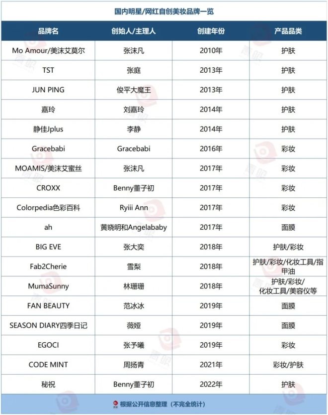 青眼不完全統(tǒng)計(jì),國(guó)內(nèi)目前共有近20位明星/網(wǎng)紅推出過(guò)美妝品牌。國(guó)內(nèi)明星網(wǎng)紅自創(chuàng)美妝品牌經(jīng)歷了靠面膜出圈,到彩妝興起,再到回歸護(hù)膚的三個(gè)階段。