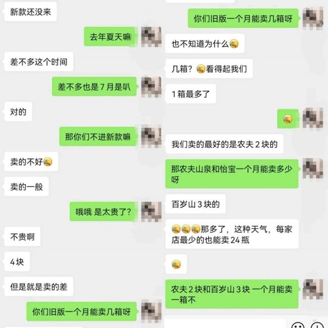 在價格上,新舊款都是原價120元/箱,每瓶均價5元,折后96元/箱,每瓶均價4元。但據(jù)媒體報道,在6月溝通會上,官方針對新款給出的建議零售價是3元。從5元降價到3元,在瓶裝水行業(yè),這已經(jīng)進入到競爭最激烈的價格帶,以農(nóng)夫山泉零售價的變動為例,自2012年由1.5元提升至2元起,至今已經(jīng)10年時間。在2元價格帶里,農(nóng)夫山泉和怡寶是守門員,在3元價格帶里,也有農(nóng)夫山泉旗下推出1年的新品牌長白雪和百歲山。