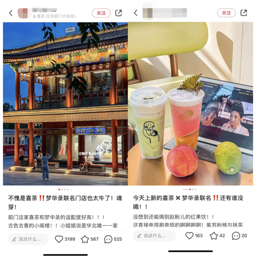 還是以《夢華錄》為例,宣布聯(lián)名后,喜茶進行了一系列立體化操作:產(chǎn)品方面,推出的兩款聯(lián)名產(chǎn)品紫蘇·粉桃飲、夢華茶喜·點茶,靈感分別來自于《夢華錄》中出現(xiàn)的“紫蘇飲子”和“茶百戲”;在配套場景搭建上,喜茶在廣州、成都、北京、深圳四地特別設(shè)置了【喜·半遮面】主題店,無論是裝修還是產(chǎn)品都與《夢華錄》劇情高度關(guān)聯(lián)。