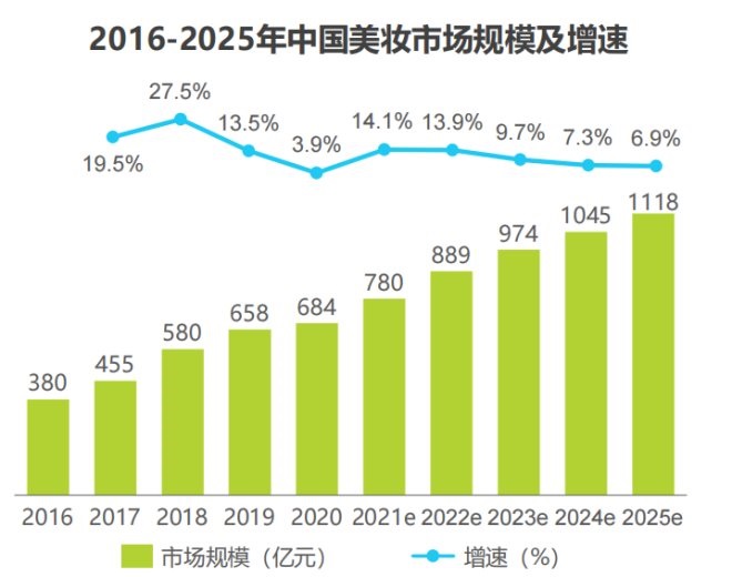 據艾瑞咨詢今年3月發(fā)布的《中國美妝護膚品行業(yè)投資研究報告》,2020年中國的彩妝市場規(guī)模已達689億元,至2025年市場規(guī)模將達到1118億元。從絕對增長量來說,未來三年,中國彩妝市場有預計229億元的增量。仍然是僅次于護膚品的第二大市場。